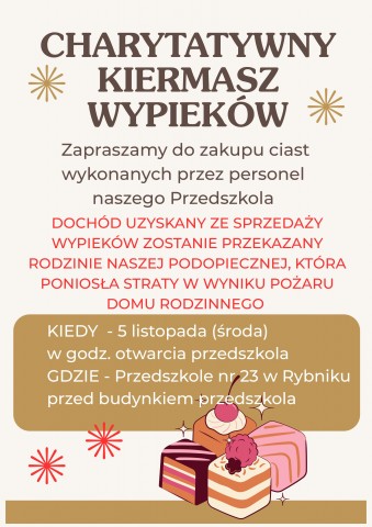 Nasze Przedszkole w dniu 5 listopada (środa) organizuje charytatywny kiermasz wypieków, z którego całkowity dochód zostanie przekazany poszkodowanej rodzinie.