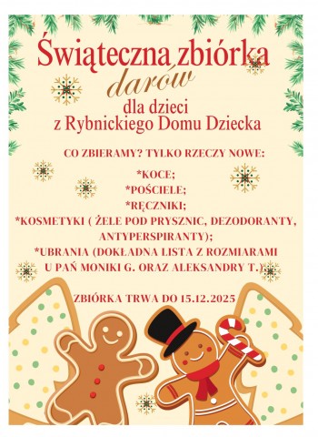 Serdecznie zapraszamy do włączenia się w świąteczną zbiórkę darów na rzecz rybnickiego Domu Dziecka. Szczegółowe informacje znajdują się na plakacie. Zbiórka trwa do 15 grudnia. Zachęcamy wszystkich do udziału i wspólnego niesienia pomocy!