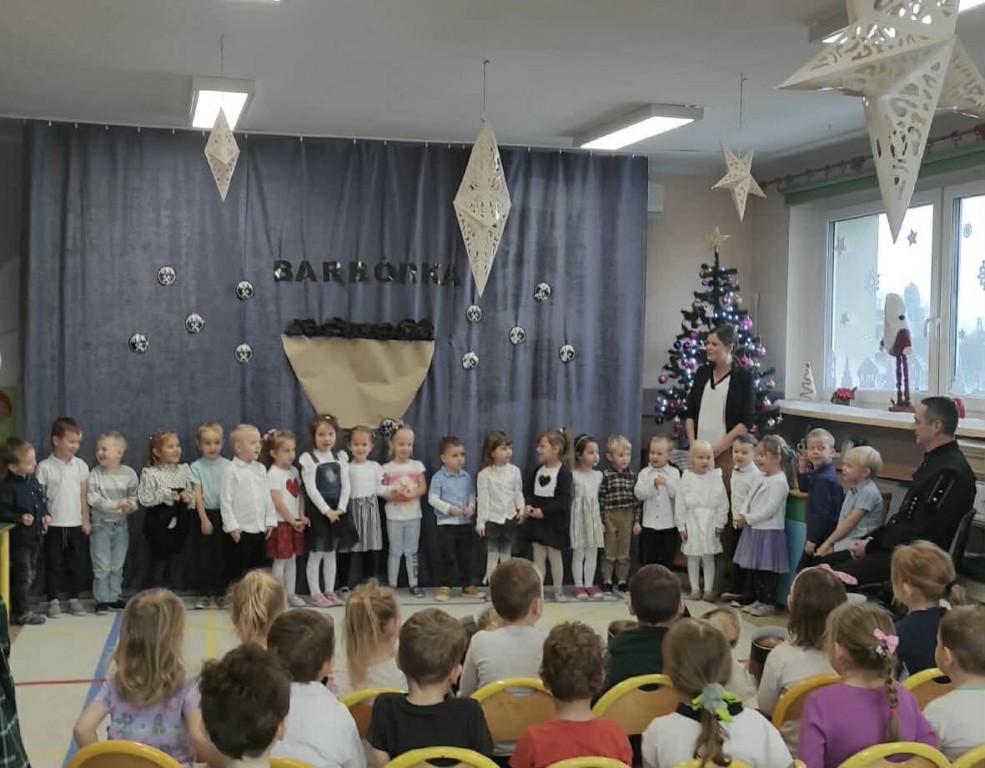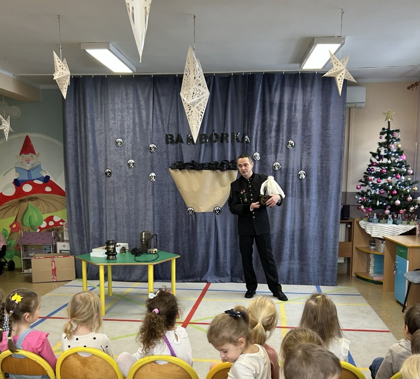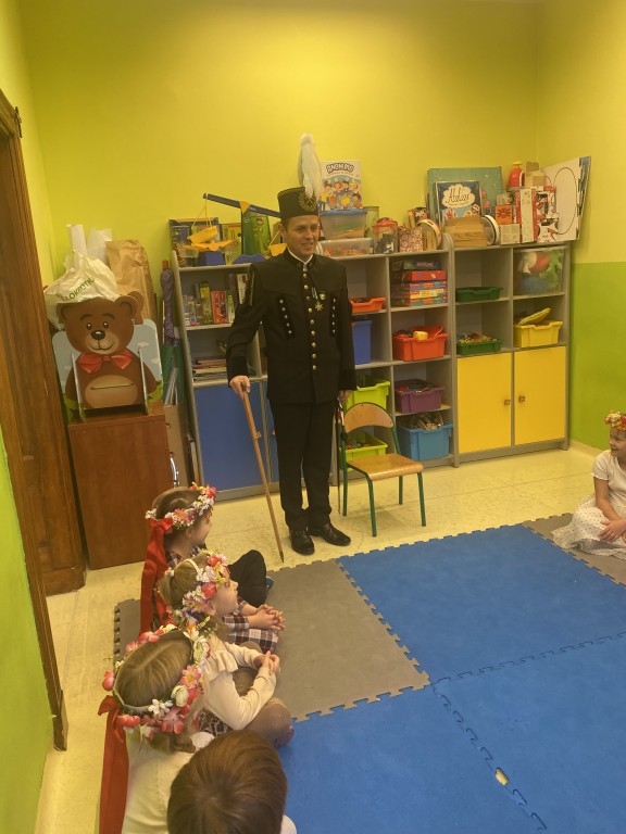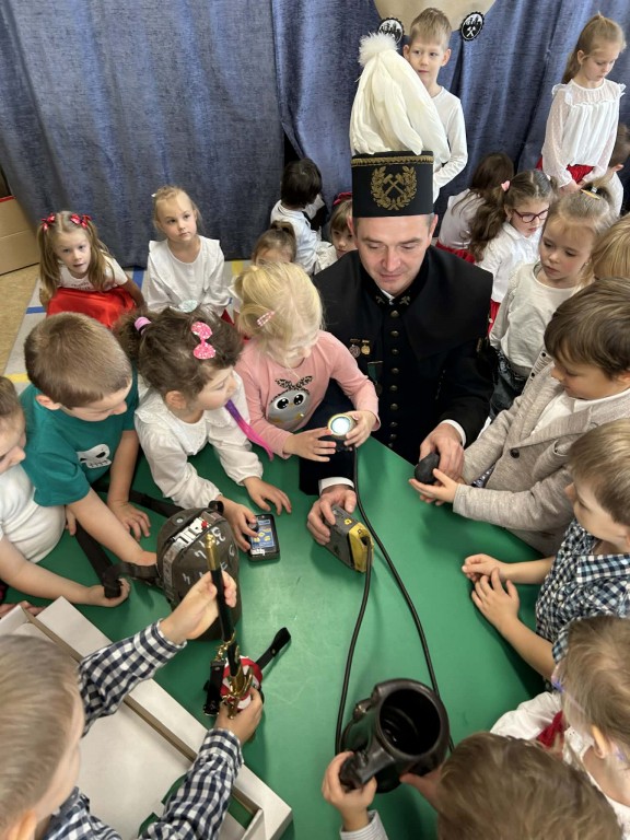 Z okazji Dnia Górnika odwiedzili nas Pan Rafał Marcisz oraz Pan Mateusz Kapała, tatusiowie naszych wychowanków, ubrani w galowy strój górniczy. Opowiedzieli dzieciom o swojej pracy oraz zaprezentowali kilka narzędzi, których górnicy używają na co dzień oraz górnicze odznaczenia.