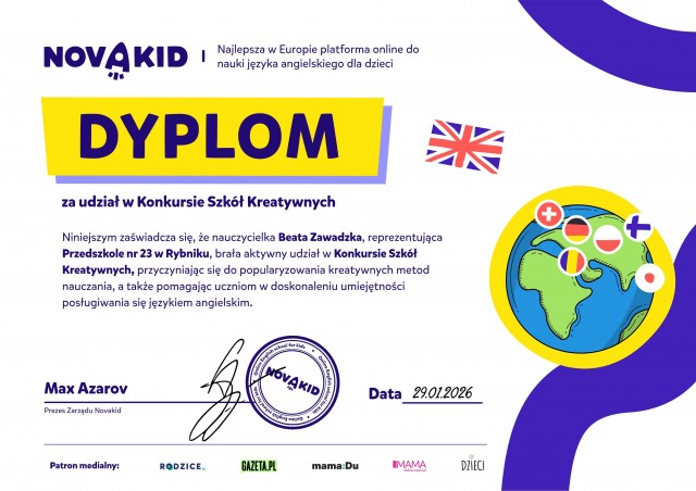 Z radością informujemy, że nasze „Pszczółki” wzięły udział w Konkursie Szkół Kreatywnych organizowanym przez Novakid. Celem konkursu było popularyzowanie kreatywnych metod nauczania oraz wspieranie przedszkolaków w nauce języka angielskiego. Udział w wydarzeniu był dla dzieci cennym i inspirującym doświadczeniem.