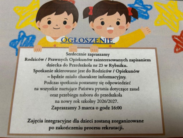 Zapraszamy na spotkanie rodziców/opiekunów prawnych zainteresowanych zapisaniem dziecka do naszego przedszkola.