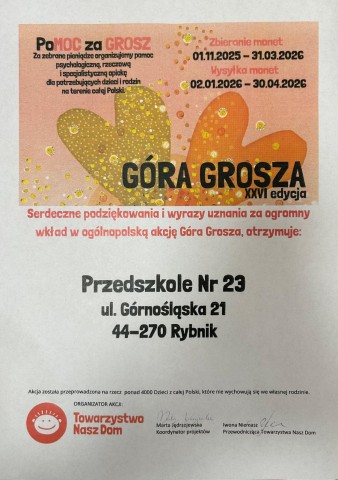 Serdecznie dziękujemy Rodzicom naszych przedszkolaków za zaangażowanie i wsparcie akcji „Góra Grosza”. Dzięki wspólnemu wysiłkowi udało się zebrać środki, które pomogą dzieciom potrzebującym opieki i wsparcia.